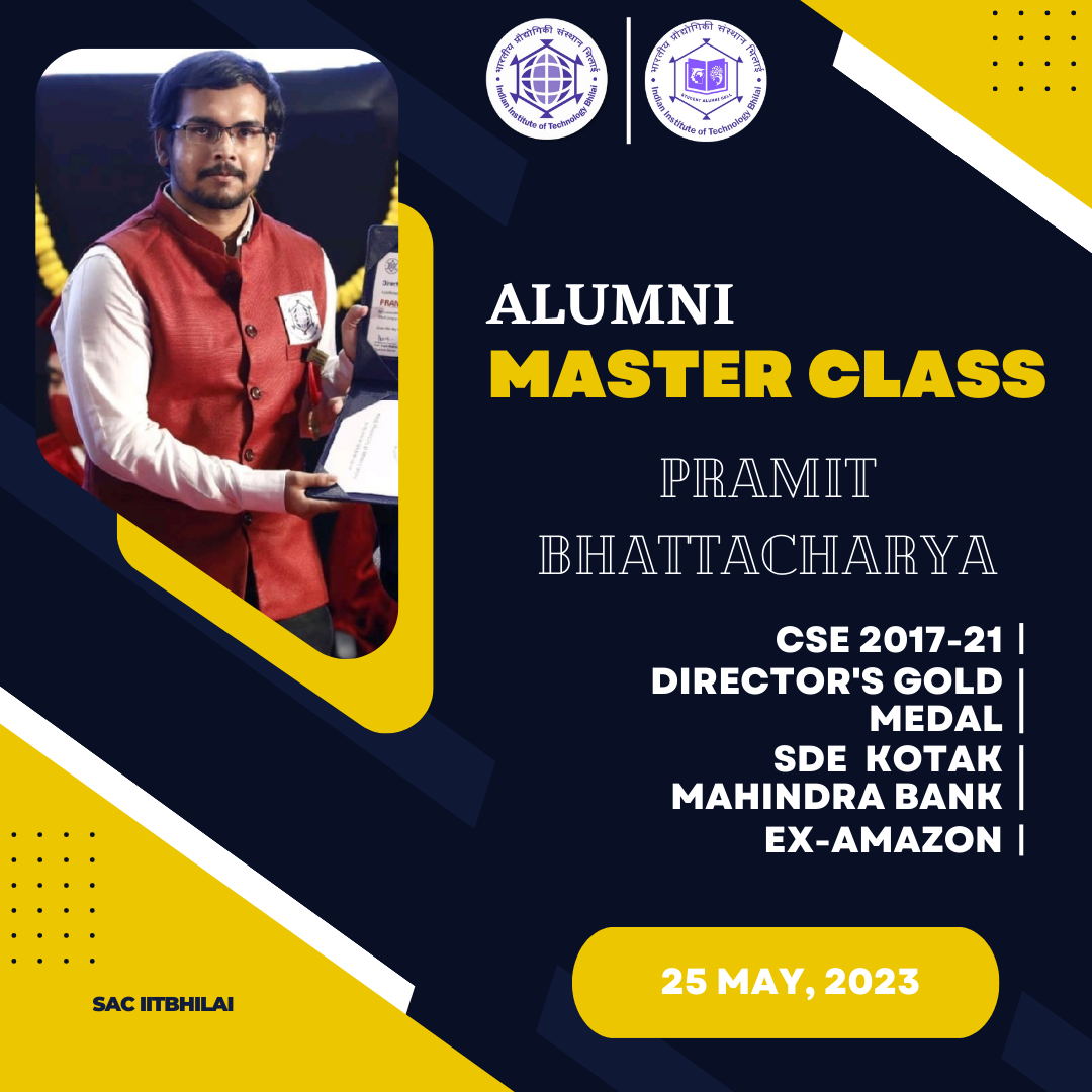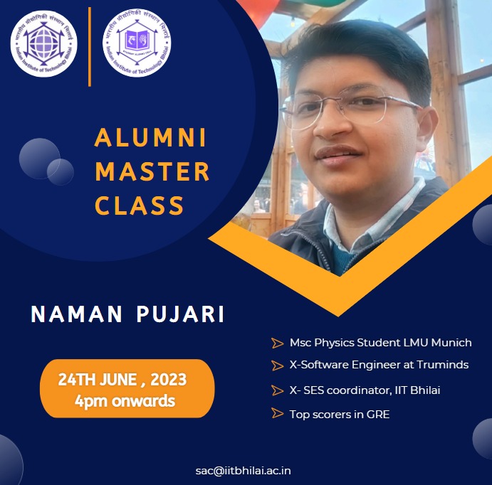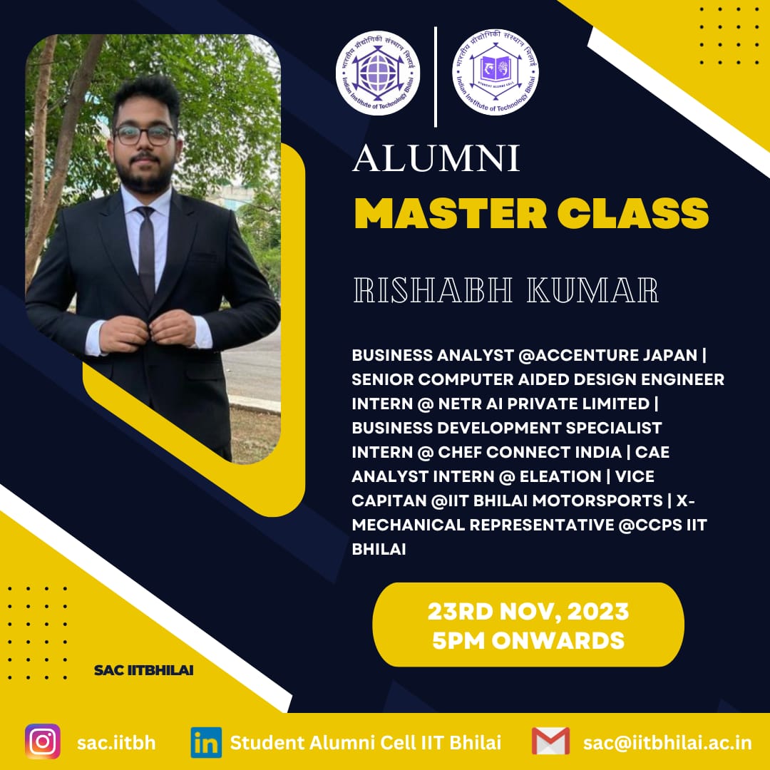Alumni Masterclass is one of the unique flagship events of Student Alumni Cell, IIT Bhilai which is an incredible platform for the current students of IIT Bhilai to have a highly interactive session with the alumni directly. It is mainly aimed at leveraging the potential benefits of alumni-student interaction to the fullest. Students can freely talk to the alumni, take career guidance, gets handy tips etc. Alumni can share their success stories, which would boost the students’ confidence and fill them with lots of zeal and enthusiasm.