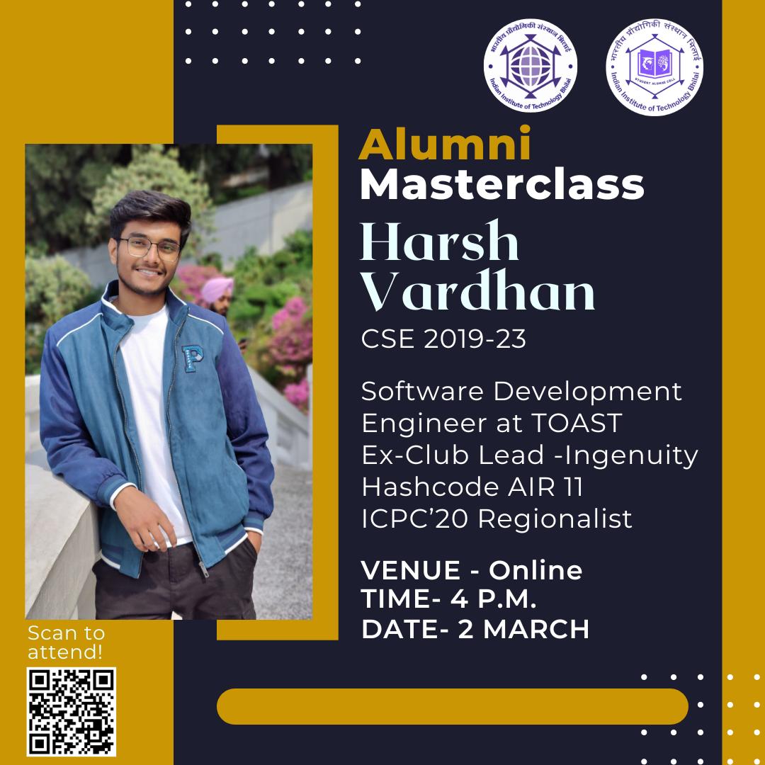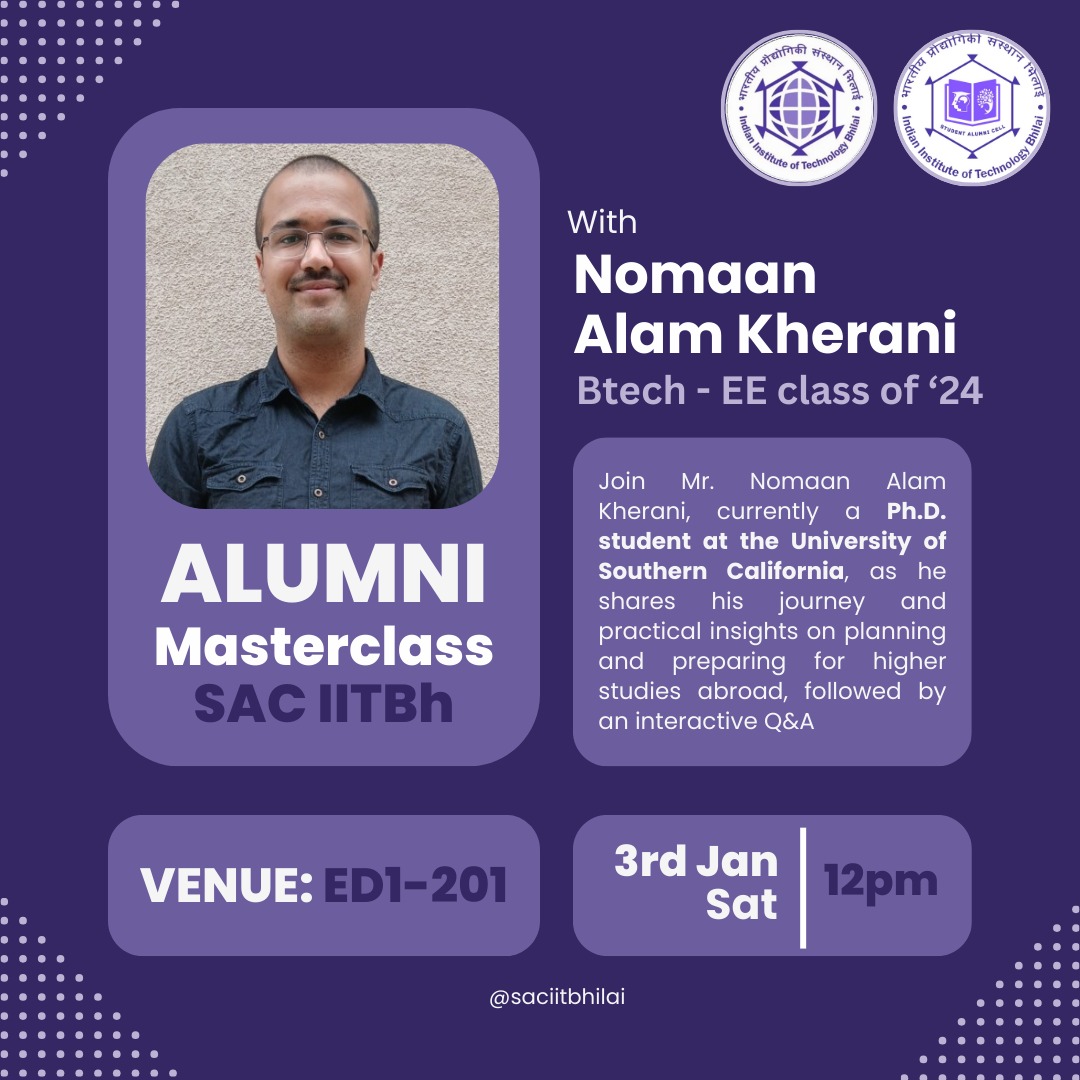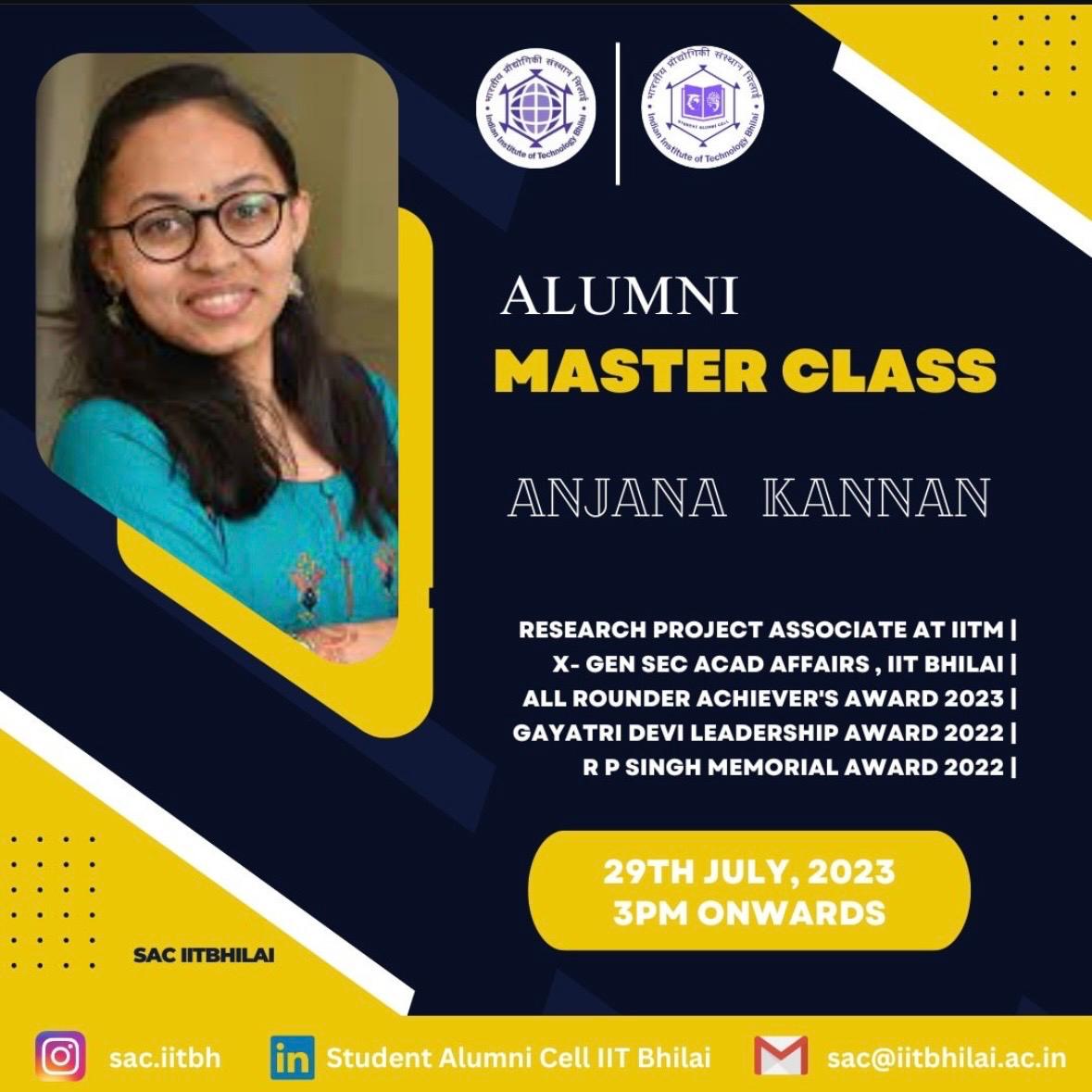 Alumni Masterclass is one of the unique flagship events of Student Alumni Cell, IIT Bhilai which is an incredible platform for the current students of IIT Bhilai to have a highly interactive session with the alumni directly. It is mainly aimed at leveraging the potential benefits of alumni-student interaction to the fullest. Students can freely talk to the alumni, take career guidance, gets handy tips etc. Alumni can share their success stories, which would boost the students’ confidence and fill them with lots of zeal and enthusiasm.